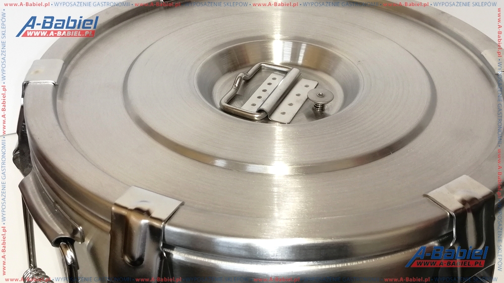 Pojemnik termoizolacyjny wyposażony jest w dwa wykonane ze stali nierdzewnej, masywne uchwyty ułatwiające transport oraz sześć zatrzasków zamykających pokrywę. Wysoka jakość i wytrzymałość tych elementów, gwarantuje wieloletnie bezawaryjne użytkowanie.